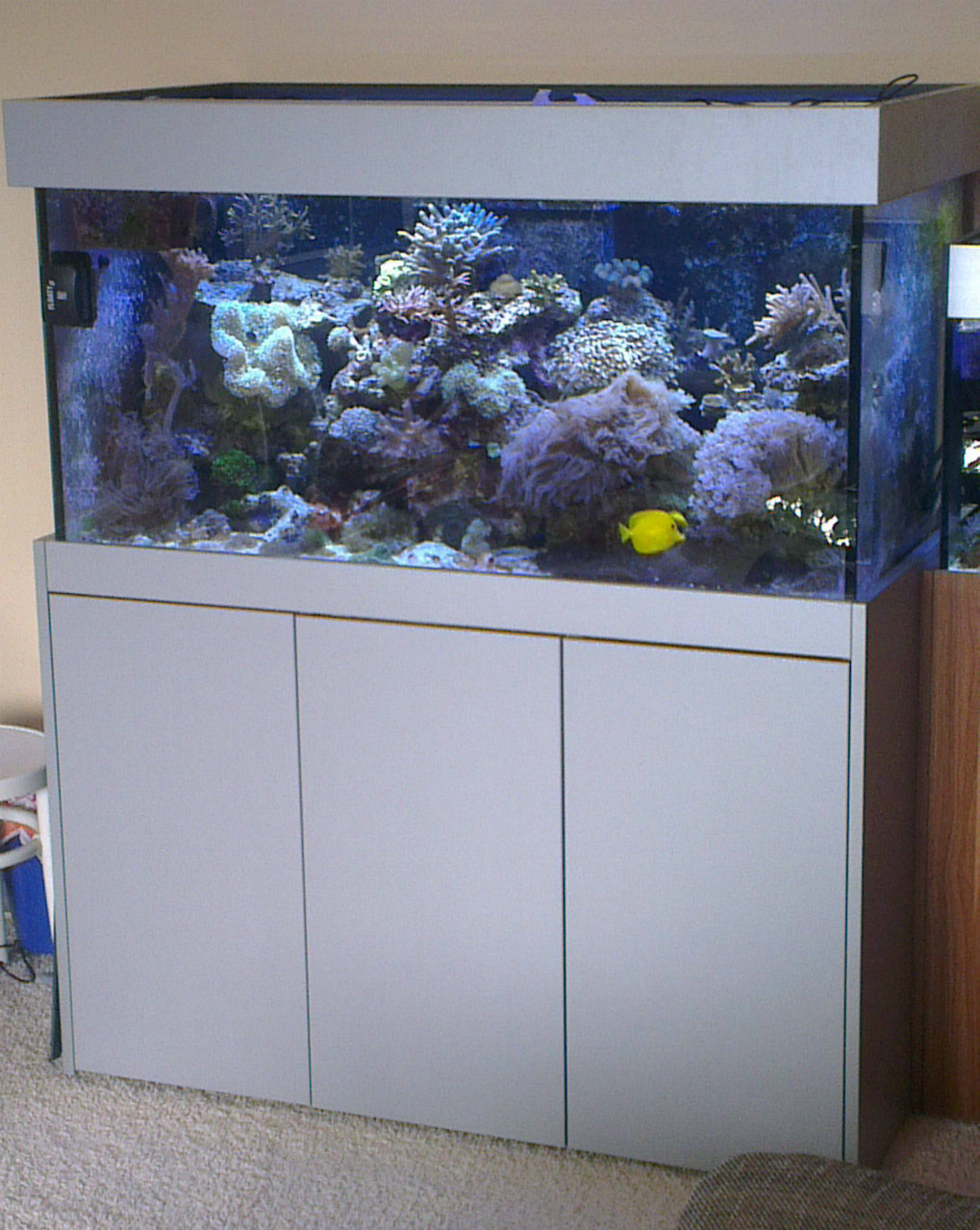 Dies ist mein Riff im Wohnzimmer. Es handelt sich um ein 430Liter fassendes Aquarium, was nach meinen Plänen angefertigt wurde. Mein kleineres Ablegerbecken, was rechts zu sehen ist, werde ich extra vorstellen.